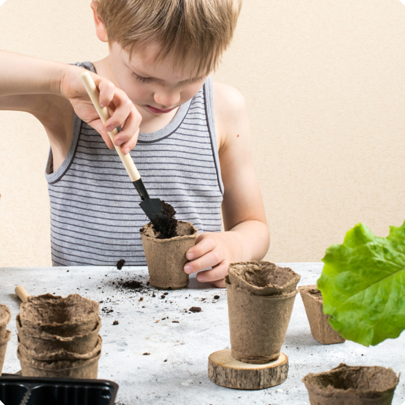 Vi sår frø med barna som de får med seg hjem. Vi har med ulike frø, f.eks. karse, vannmelon, jord...